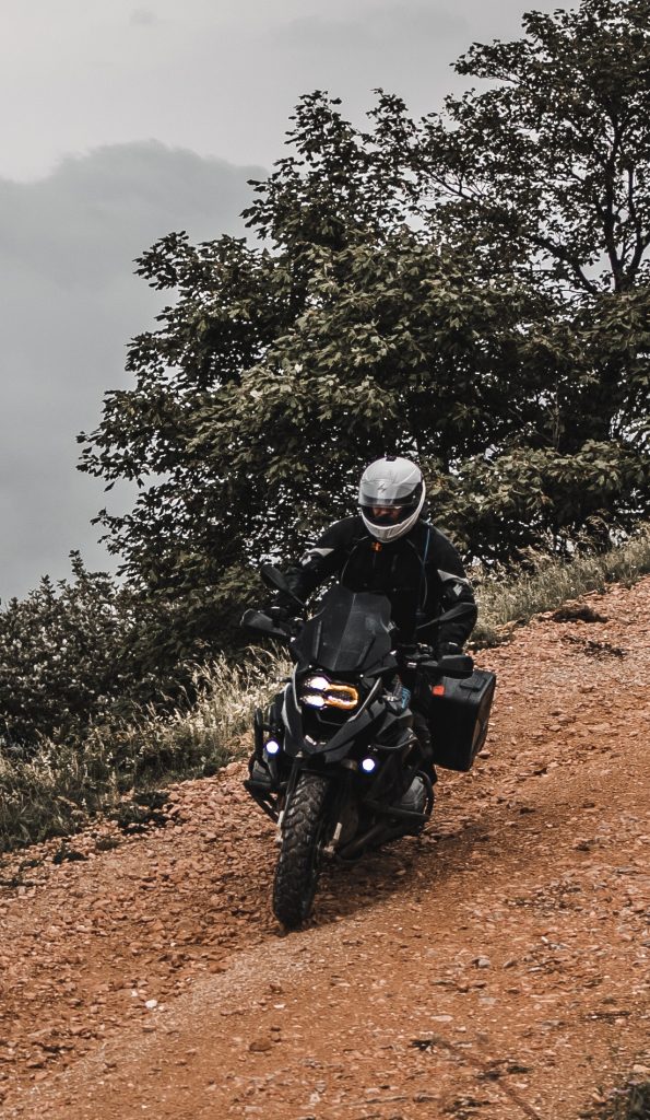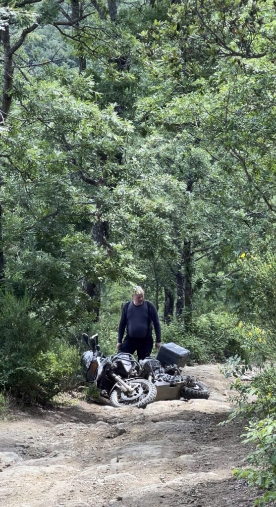 Die Anreise am ersten Tag war so ziemlich das Einzige was planmäßig verlief. Bereits am zweiten Tag fing es mittags so stark zu regnen an, dass wir viel langsamer waren, als geplant. Es gab auch schon einen ersten Sturz nach den ersten Metern Schotter. Mit Gepäck fährt es sich im Gelände halt doch anders als ohne ;-). Wegen des starken und andauernden Regens verließ uns die Bandit bereits am Nachmittag. Zu zweit kürzten wir unsere Anreisestrecke massiv ab. Trotzdem übernachteten wir 300km vor dem Ziel. Das mussten wir am nächsten Tag dann aufholen.